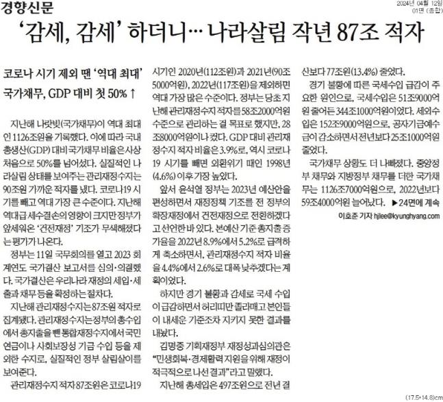 이게 건전재정? 나랏빚 1126조 원 파장에 '통계 꼼수' 논란까지 News2024. 4. 15. 11:44