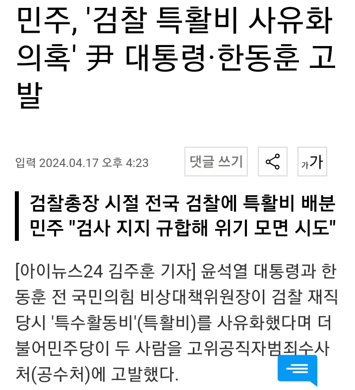 더불어민주당은 17일 윤석열 대통령과 국민의힘 한동훈 전 비상대책위원장이 각각 검찰총장과 법무부 장관 시절 검찰 특수활동비 과다 지급과 오·남용 은닉에 관여했다며 고위공직자범죄수사