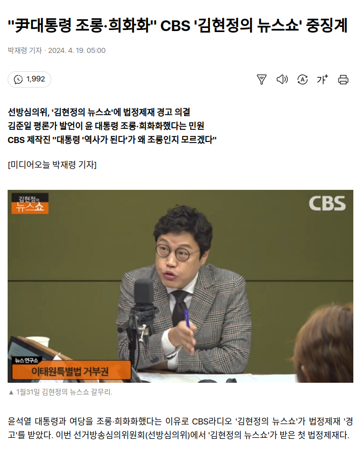 “尹대통령 조롱·희화화” CBS ‘김현정의 뉴스쇼’ 중징계 News2024. 4. 19. 10:20