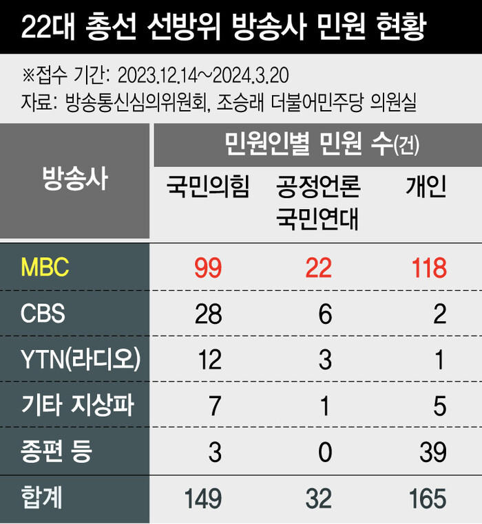 22대 국회의원선거방송심의위원회(선방위)의 정당·단체 민원 181건이 모두 국민의힘과 보수 언론단체 공정언론국민연대(공언련)에서 제기한 것으로 확인됐다. 이들은 주로 문화방송(MBC) 시사·
