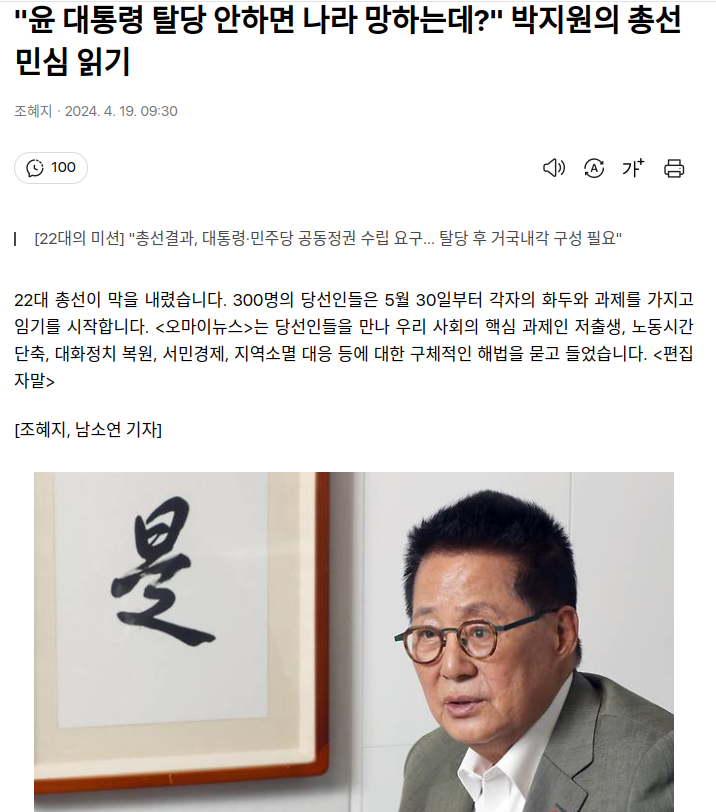 "윤 대통령 탈당 안하면 나라 망하는데?" 박지원의 총선민심 읽기