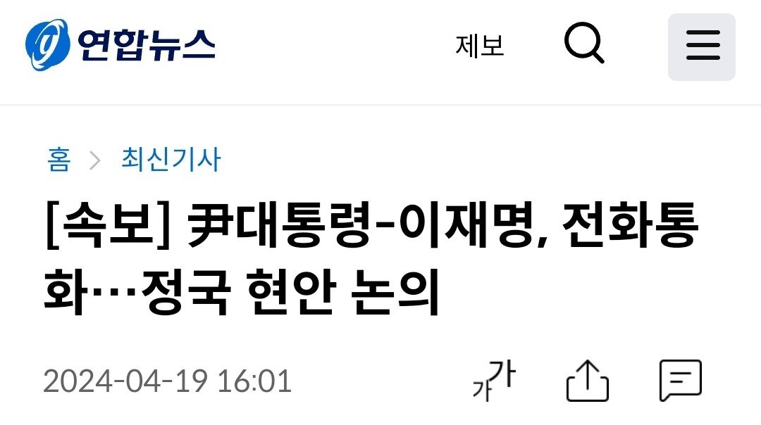 | [속보] 尹대통령, 이재명 대표에 "다음 주 용산에서 만나자" (0) | 2024.04.19 |