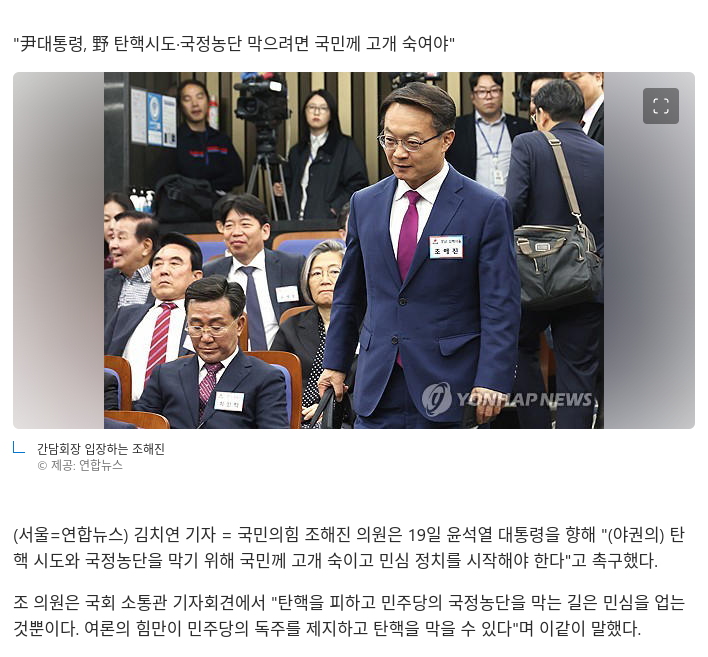 "尹대통령, 野 탄핵시도·국정농단 막으려면 국민께 고개 숙여야"