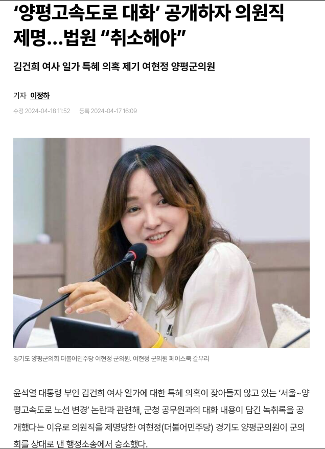 法, ‘양평고속道 녹취 공개’ 여현정 제명 취소…“공적 업무” ,‘양평고속도로 대화’ 공개하자 의원직 제명…법원 “취소해야” News2024. 4. 20. 10:30