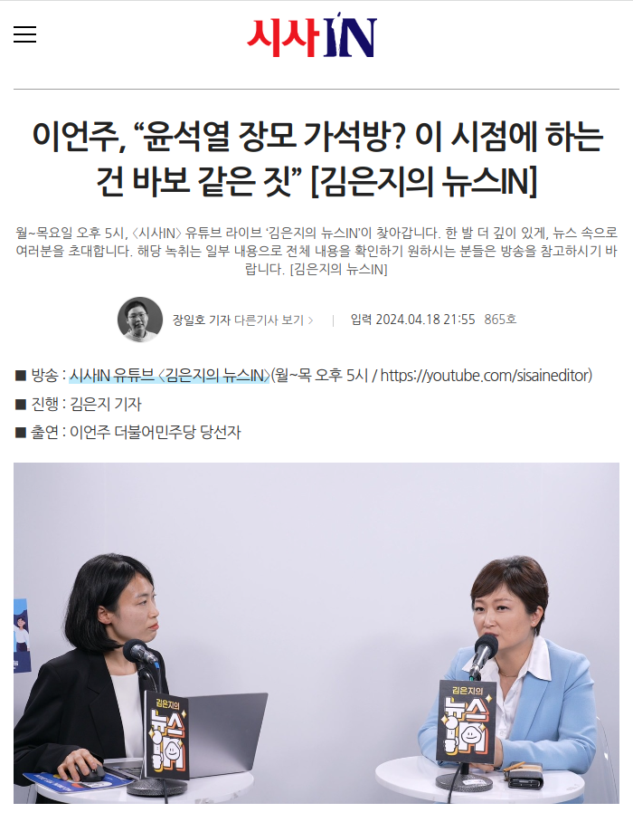 이언주, “윤석열 장모 가석방? 이 시점에 하는 건 바보 같은 짓” [김은지의 뉴스IN] News2024. 4. 20. 10:53