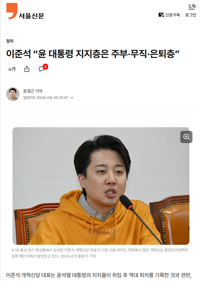 이준석 “윤 대통령 지지층은 주부·무직·은퇴층” News2024. 4. 20. 12:02