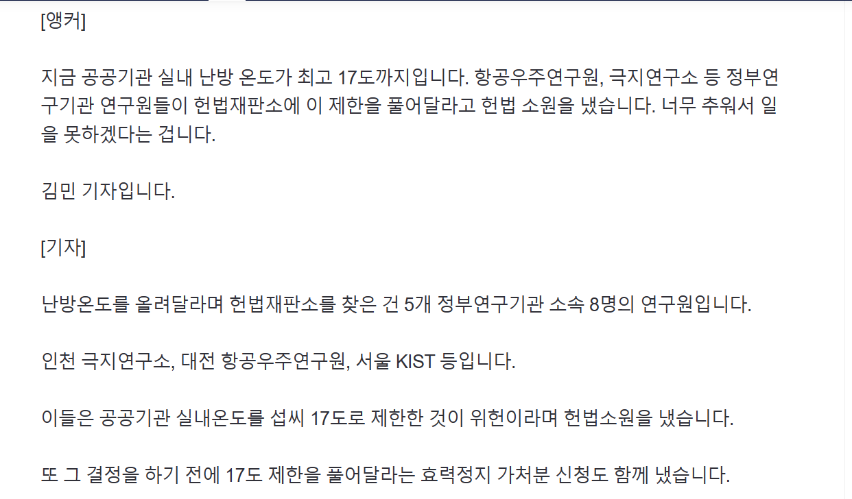 지금 공공기관 실내 난방 온도가 최고 17도까지입니다. 항공우주연구원, 극지연구소 등 정부연구기관 연구원들이 헌법재판소에 이 제한을 풀어달라고 헌법 소원을 냈습니다. 너무 추워서 일을