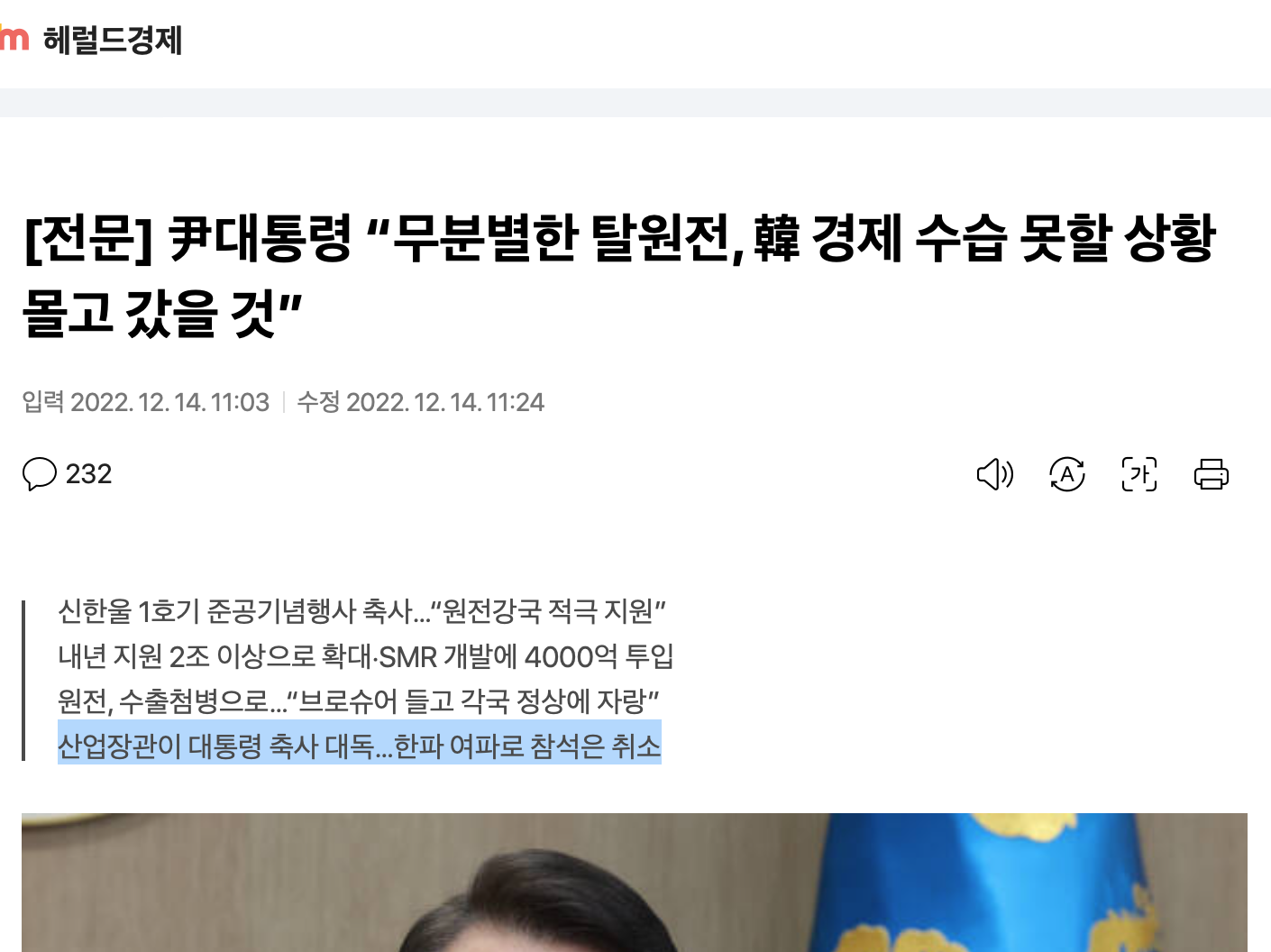 | 윤석열, “무분별한 탈원전, 韓 경제 수습 못할 상황 몰고 갔을 것” (0) | 2022.12.14 |
