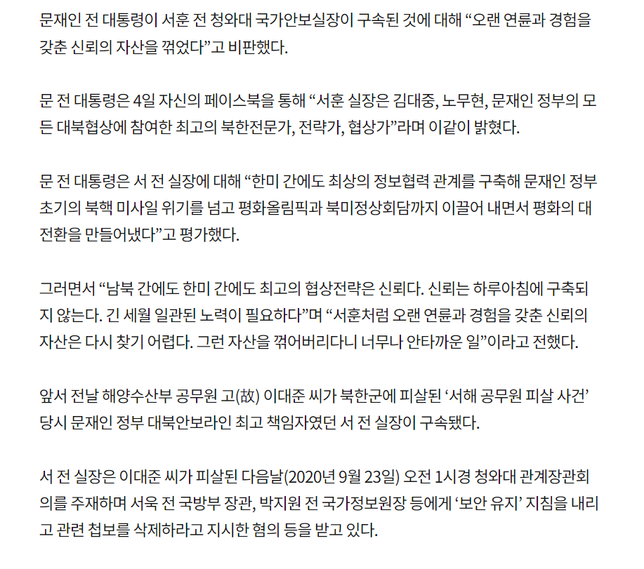 문재인 전 대통령이 서훈 전 청와대 국가안보실장이 구속된 것에 대해 “오랜 연륜과 경험을 갖춘 신뢰의 자산을 꺾었다”고 비판했다. 문 전 대통령은 4일 자신의 페이스북을 통해 “…