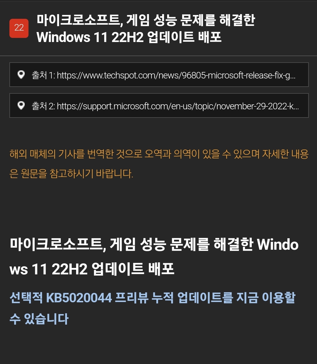 | 마이크로소프트, 게임 성능 문제를 해결한 Windows 11 22H2 업데이트 배포 (0) | 2022.12.02 |