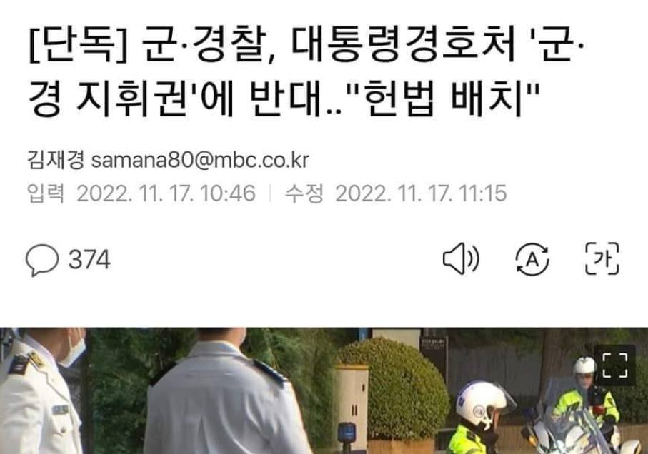 | 군-경찰, 대통령 경호처 "군경 지휘권" 에 반대... 헌법 배치 (0) | 2022.11.17 |