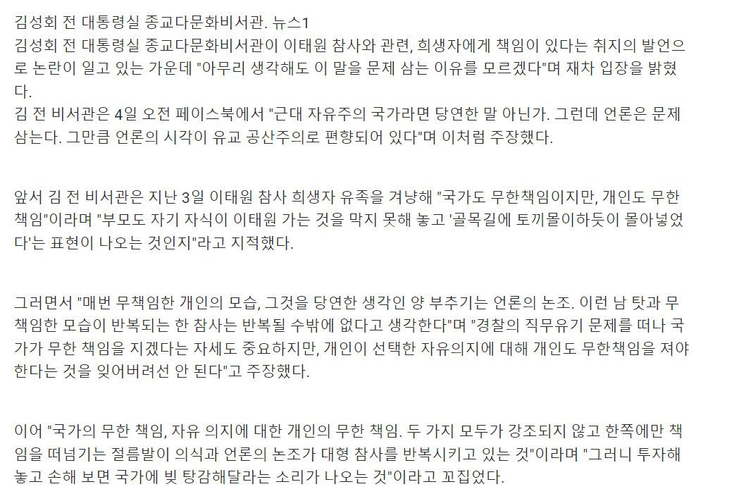 [내외일보] 이희철 기자 = 김성회 전 대통령실 종교다문화비서관이 이태원 참사와 관련해 희생자에게 책임이 있다는 취지의 발언을 해 파문이 일고 있는 가운데 "아무리 생각해도 이 말을 문제