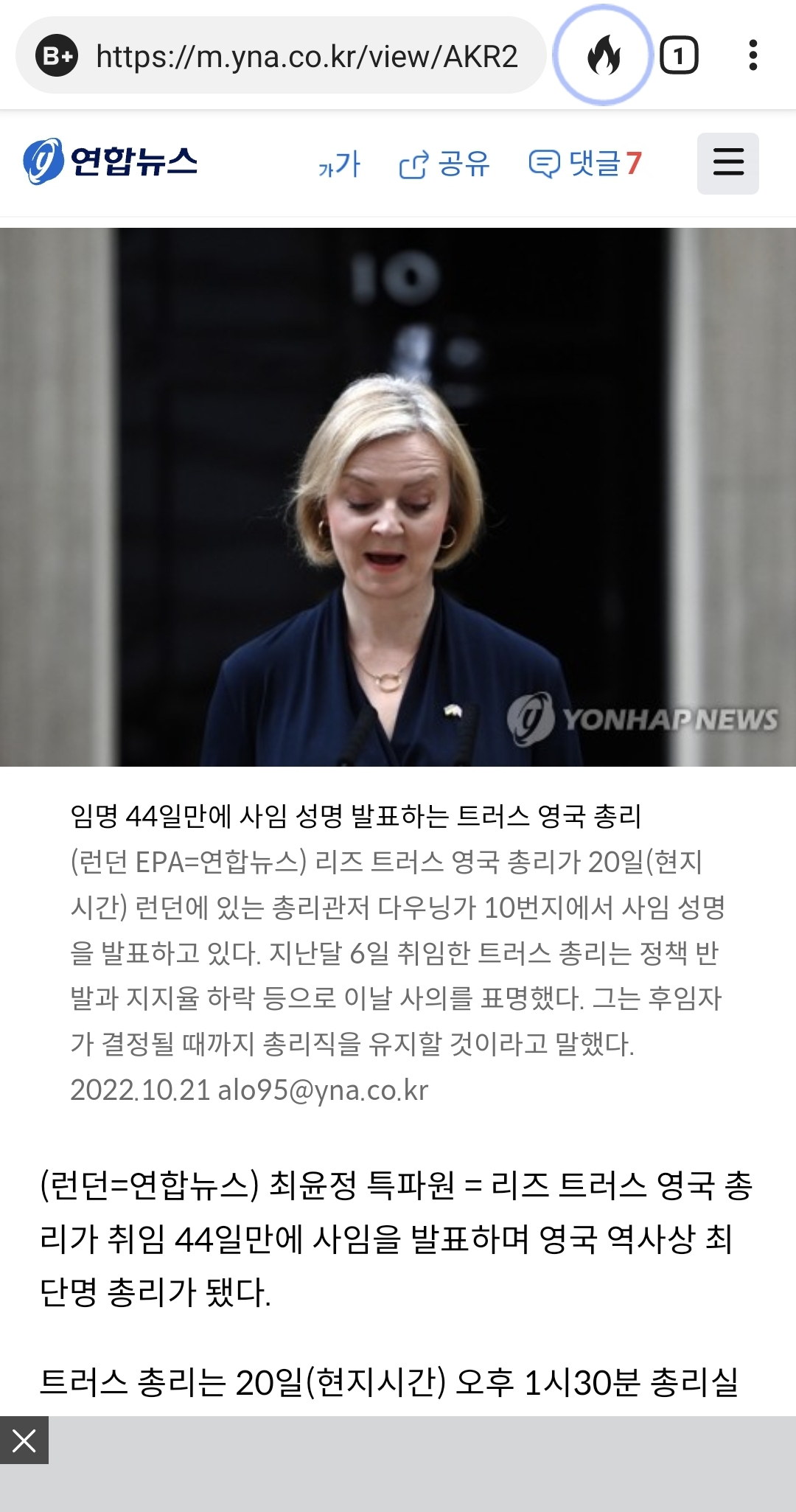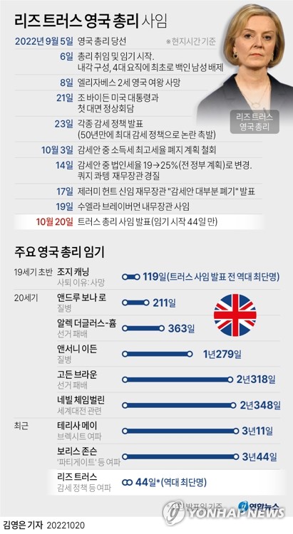 (런던=연합뉴스) 최윤정 특파원 = 리즈 트러스 영국 총리가 취임 44일만에 사임을 발표하며 영국 역사상 최단명 총리가 됐다.