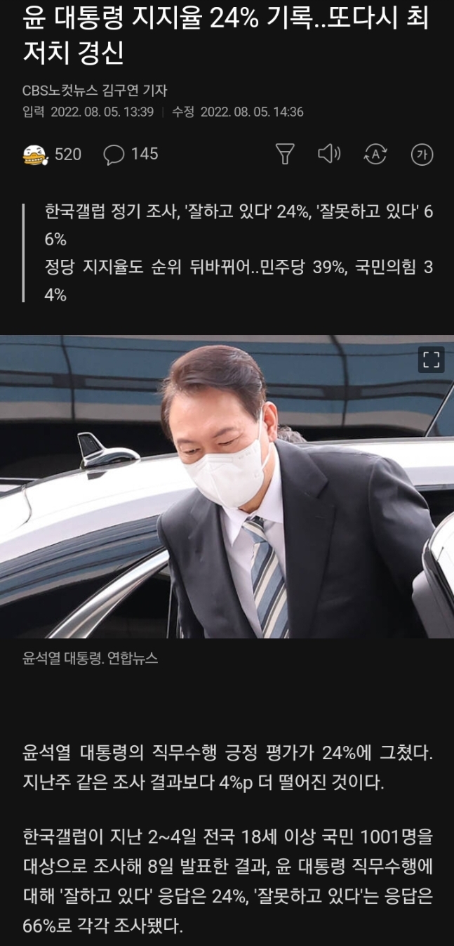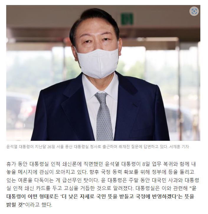| '본인 리스크' 윤 대통령, 업무 복귀 후 '대국민 사과'? 할리가 (0) | 2022.08.08 |
