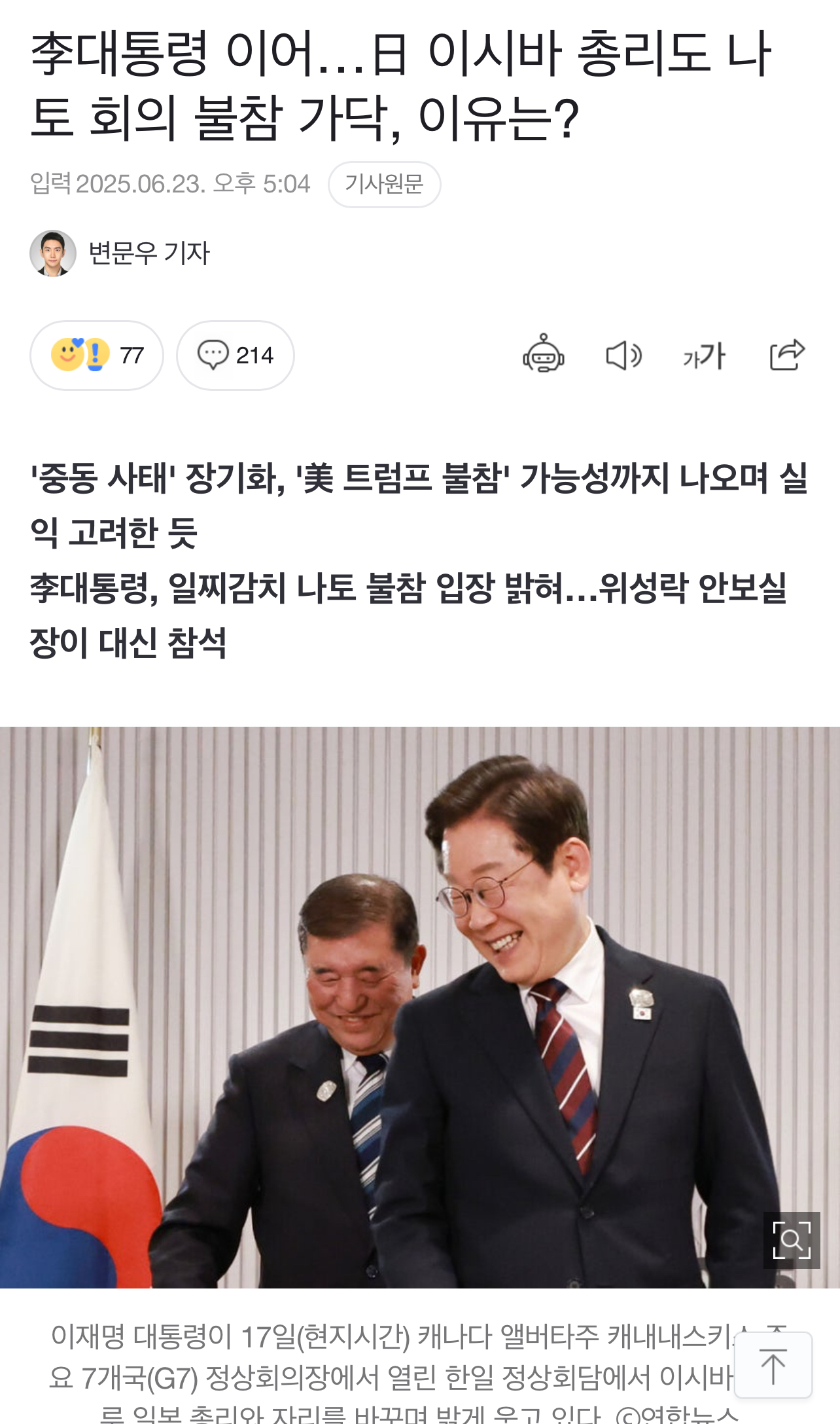 | 이 대통령 이어 이시바 총리 NATO 회의 불참 가닥 (0) | 2025.06.24 |