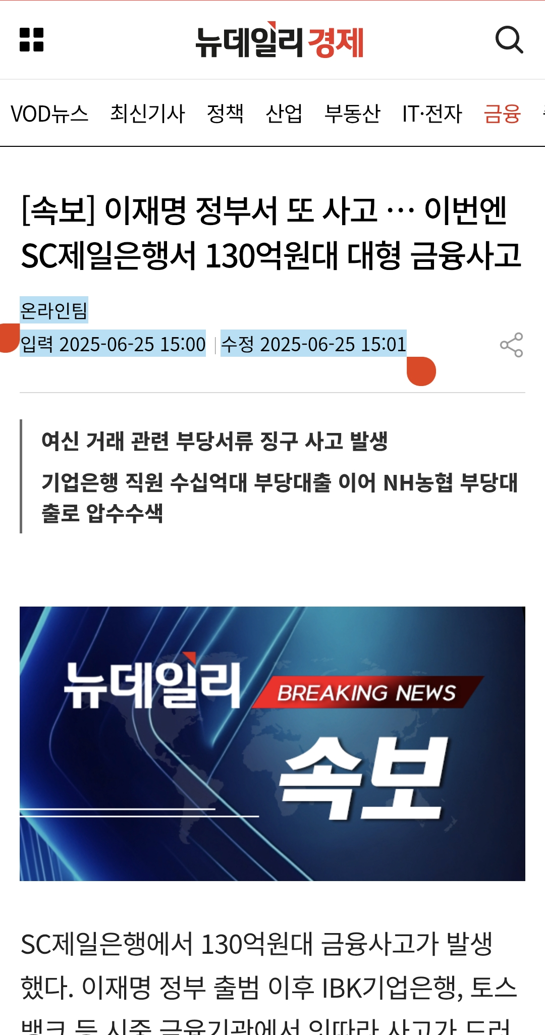 | 기레기 제목 뽑는거 보소. "[속보] 이재명 정부서 또 사고 … 이번엔 SC제일은행서 130억원대 대형 금융사고" (0) | 2025.06.25 |