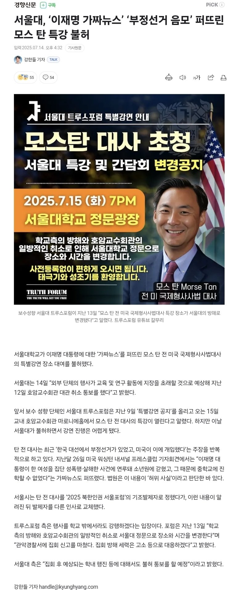 서울대, 이재명 가짜뉴스 부정선거 음모 퍼뜨린 모스 탄 특강 불허 (1) | 2025.07.14 |