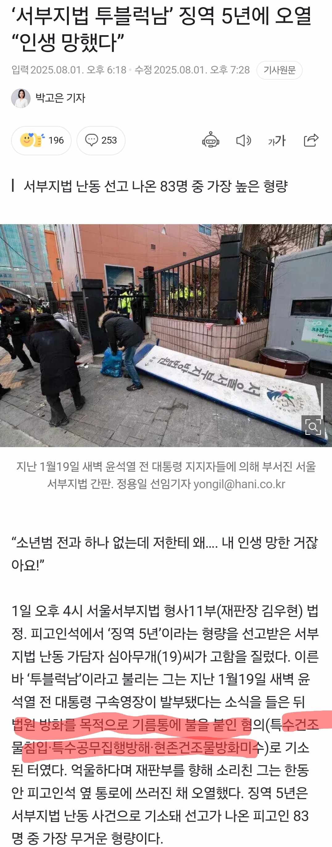 | 서부지법 투블럭남 징역 5년에 오열 “인생 망했다” (2) | 2025.08.01 |