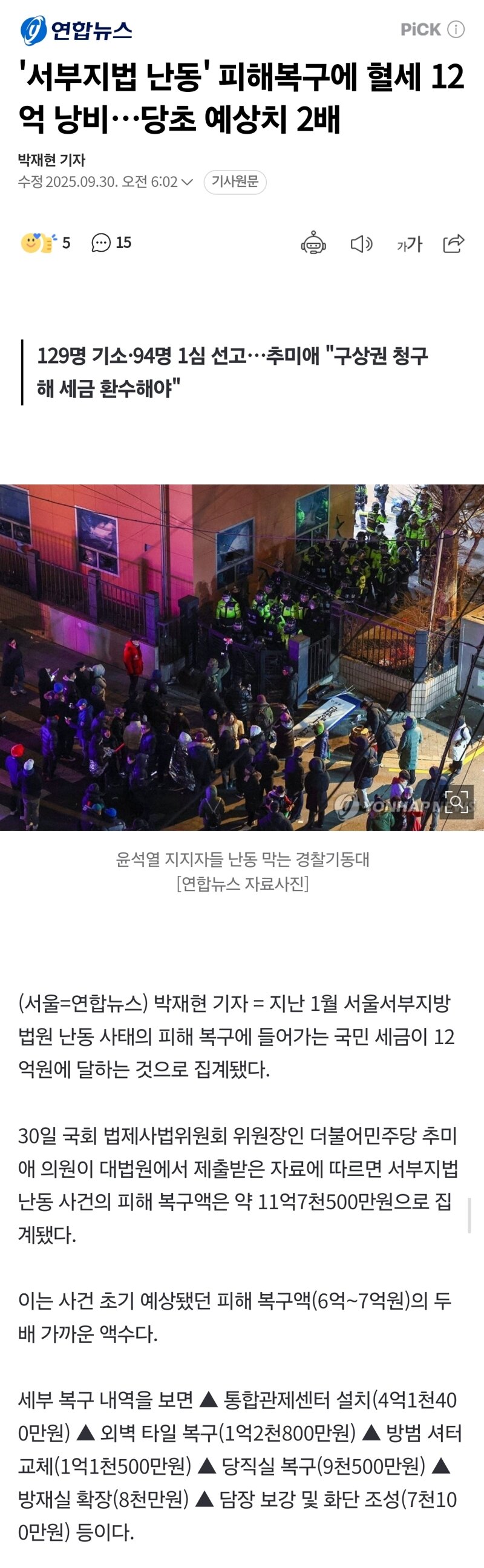 윤석열 지지자들, ’12억 배상’ 위기…‘오열’, 서부지법 난동' 피해복구에 혈세 12억 낭비…당초 예상치 2배 News2025. 9. 30. 09:08