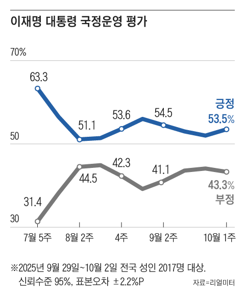 이재명 대통령의 국정수행 지지율이 53.5%를 기록하며 4주 만에 반등했다는 리얼미터 여론조사 결과가 6일 발표됐다. 이번 조사는 9월 29일부터 10월 2일까지 전국 18세 이상 유권자 2,017명을 대상으로 실시됐다.������������이 대통령의 지지율은 전주 대비 1.5%포인트 상승한 53.5%를 기록해 3주 연속 하락세를 멈추고 반등했다. 9월 첫째 주 56.0%를 기록한 뒤 9월 2주차 53.0%, 3주차 52.0%, 4주차 51.0%로 한 달간 연속 하락세를 보였으나 이번 조사에서 상승세로 돌아섰다.���