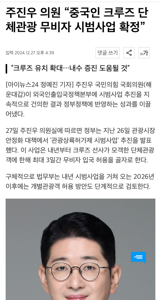 주진우 의원 “중국인 크루즈 단체관광 무비자 시범사업 확정”