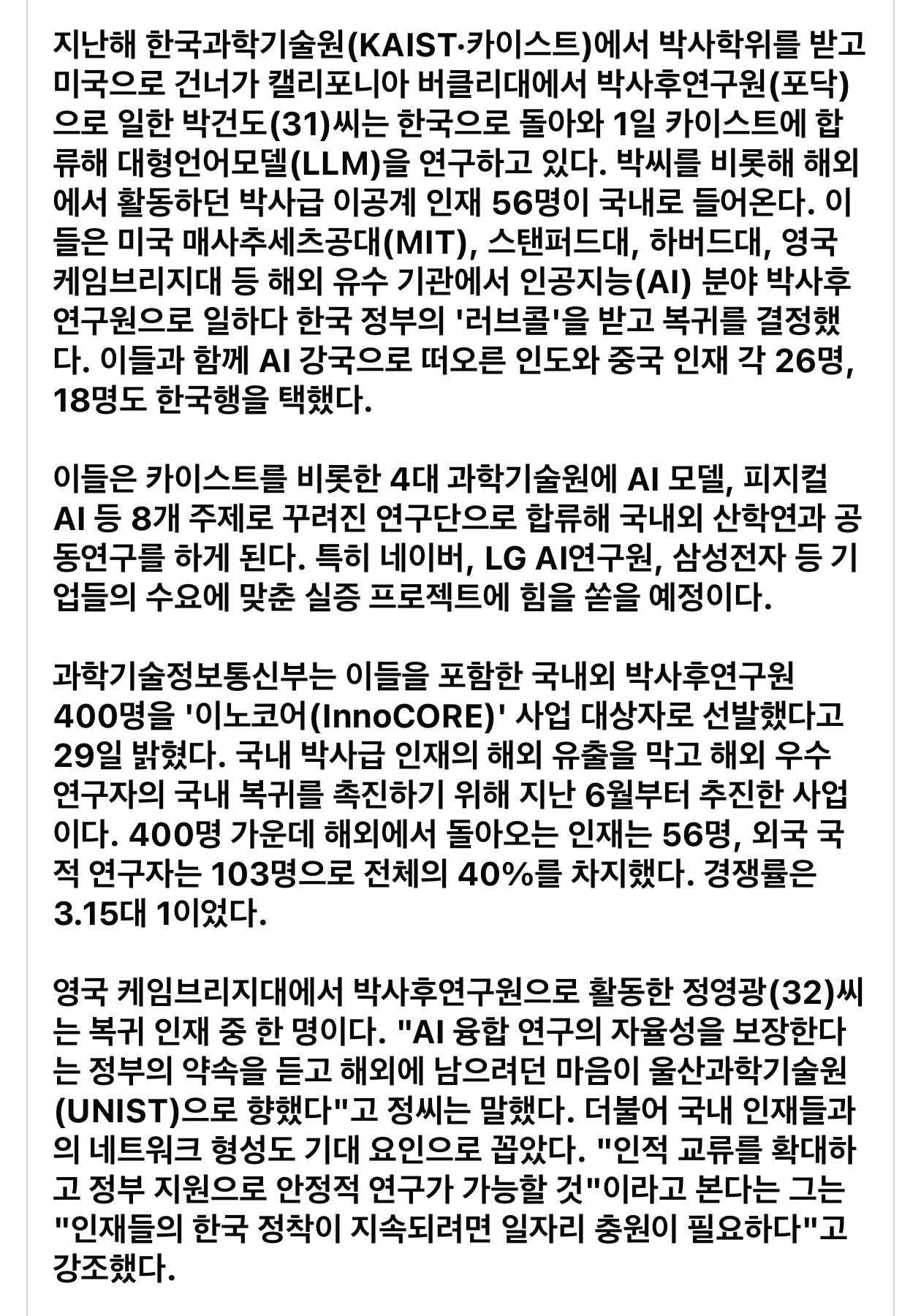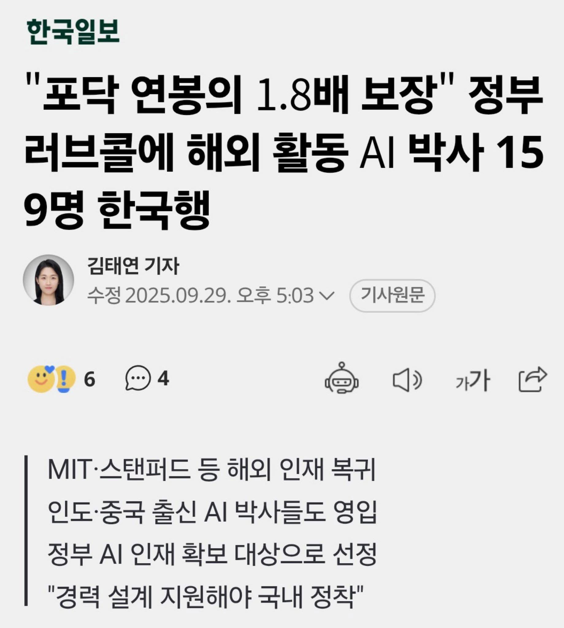 해외 AI관련분야 박사들 159명 한국컴백 AI2025. 10. 10. 15:01