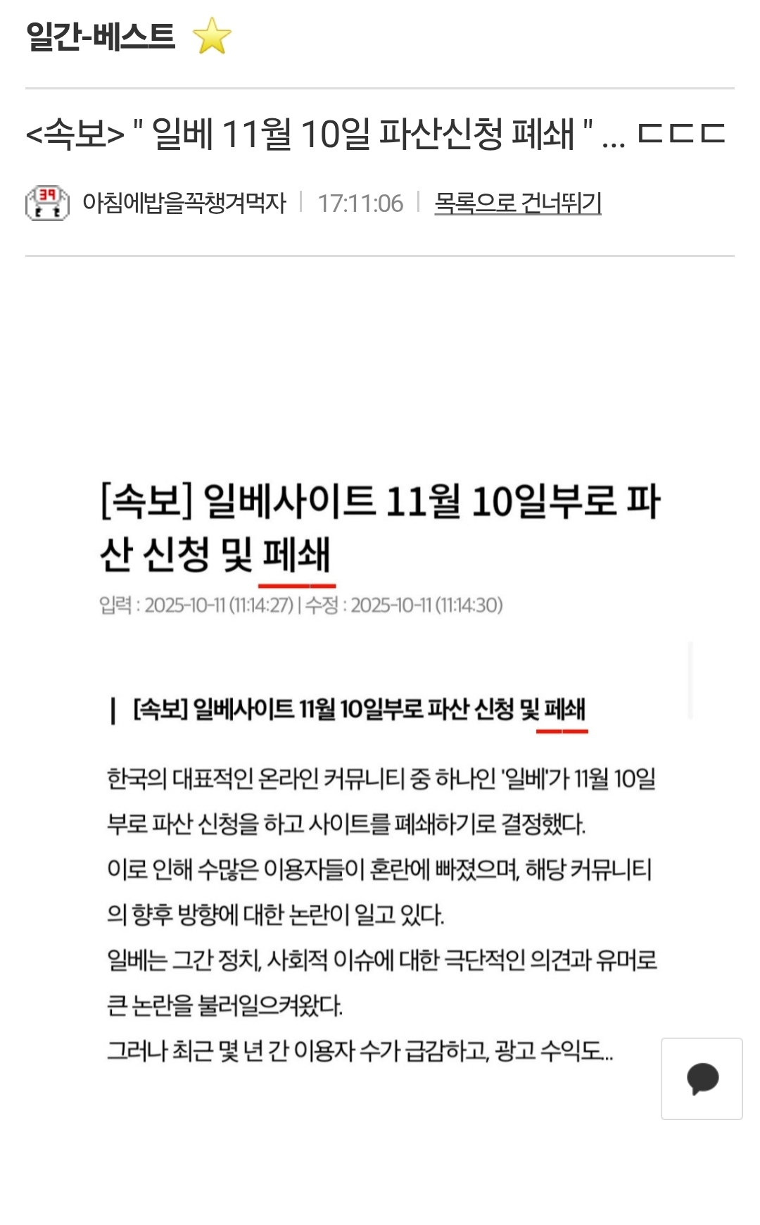 | 일베, 11월 10일 파산신청, 폐쇄 (0) | 2025.10.11 |