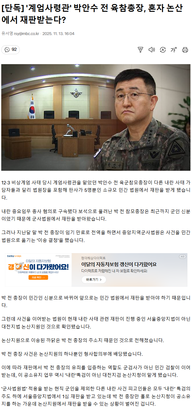 | 계엄사령관 박안수 전 육참총장 혼자 논산에서 재판 받는다 (0) | 2025.11.13 |