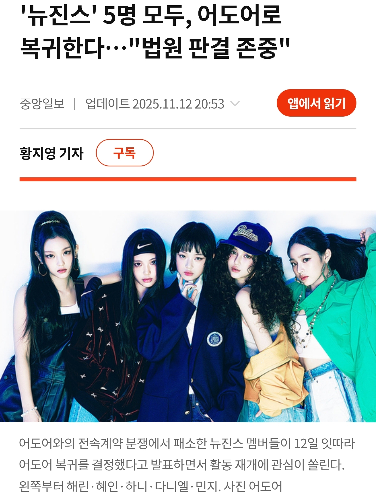 | 뉴진스(NewJeans) 멤버 5인 전원이 하이브 산하 레이블 어도어(ADOR)로 복귀 (0) | 2025.11.13 |