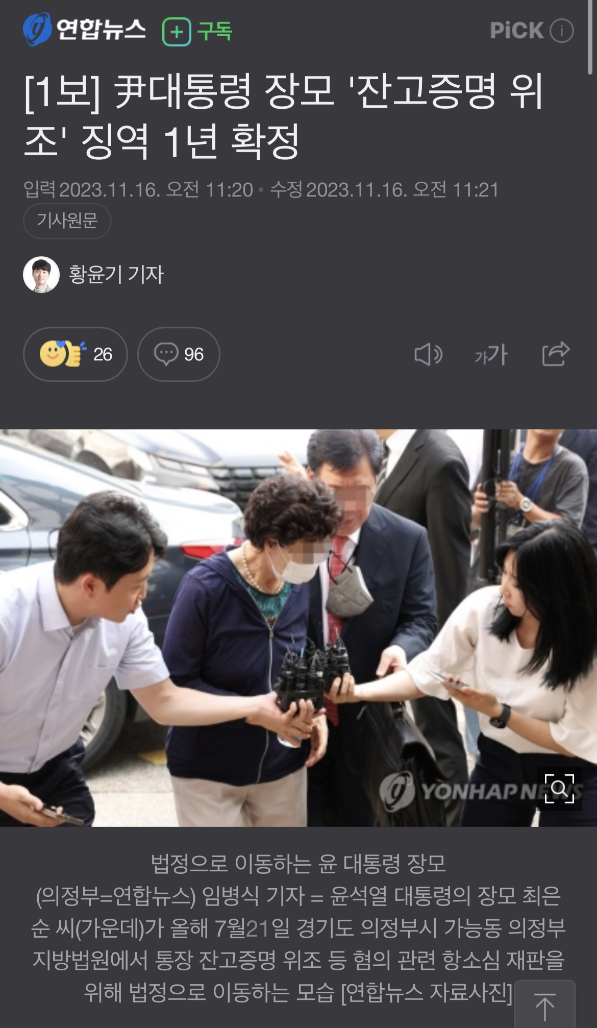 [1보] 尹대통령 장모 '잔고증명 위조' 징역 1년 확정