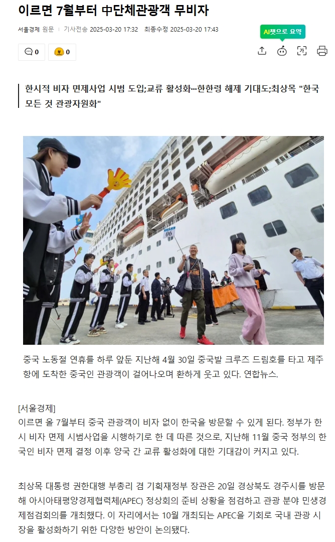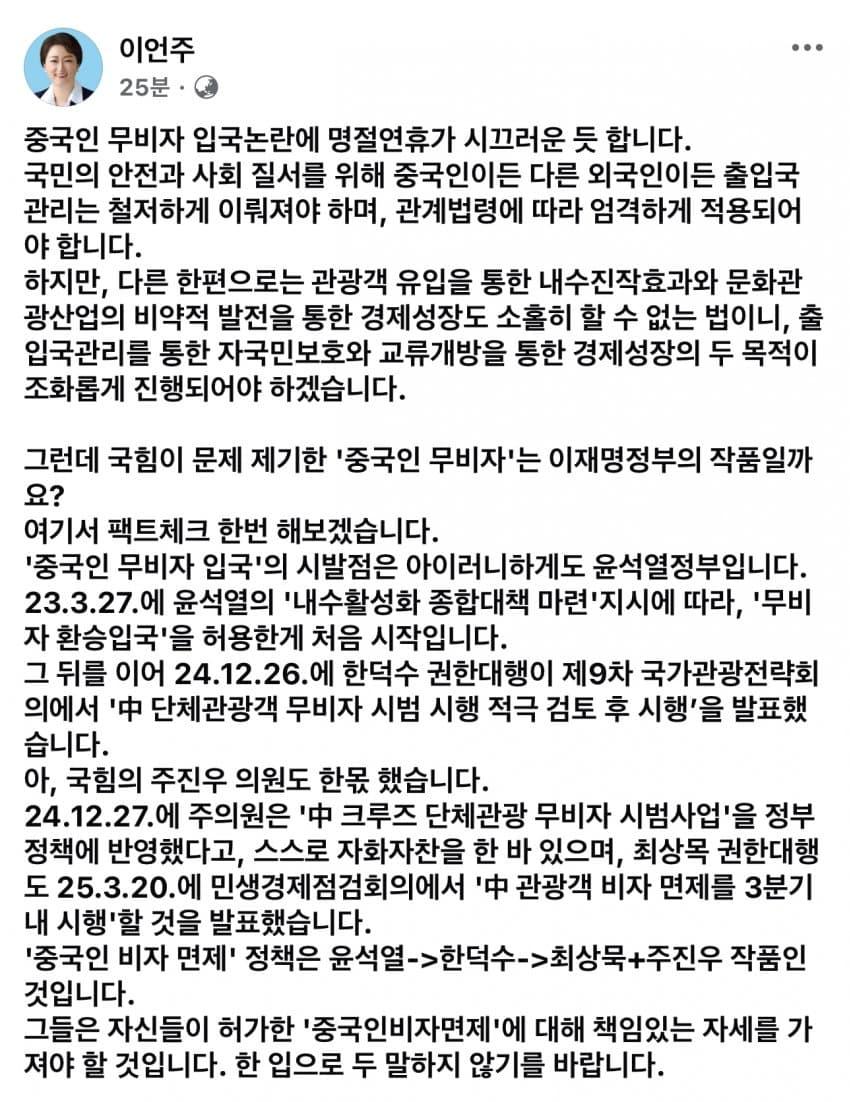 News 중국몽 이언주 중국 무비자 Ritz®™ 2025. 10. 9. 20:40 이언주 : 중국 무비자 니들이 허가 한거잖아, 팩트 체크 https://www.inews24.com/view/1798512 주진우 의원 “중국인 크루즈 단체관광 무비자 시범사업 확정”“크루즈 유치 확대…내수 증진 도움될 것” 주진우 국민의힘 국회의원(해운대갑)이 외국인출입국정책본부에 시범사업 추진을 지속적으로 건의한 결과 정부정책에 반영하는 성과를 이끌어냈www.inews24.com